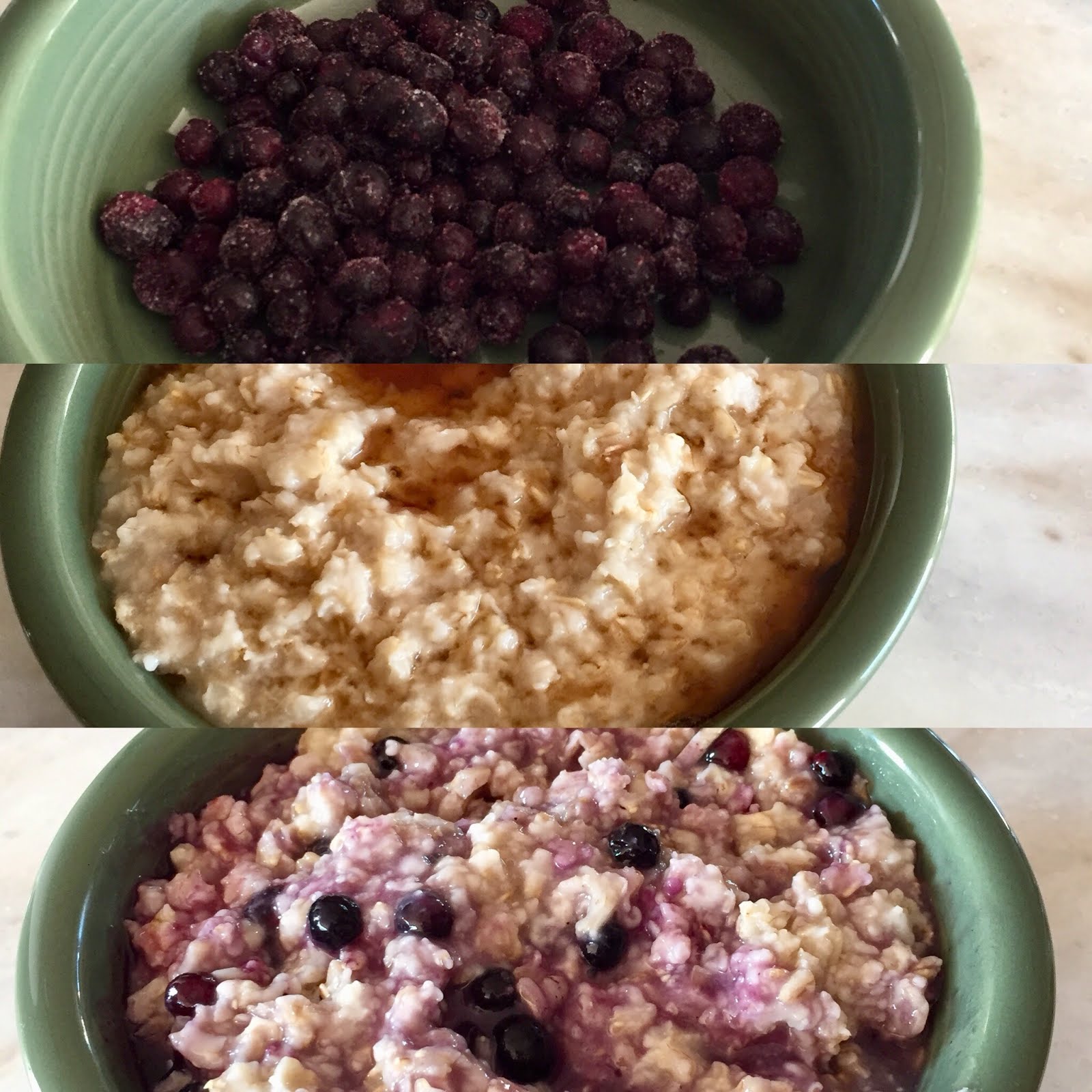 When I’m pressed for time, I put frozen wild blueberries in a bowl, then layer the hot oatmeal on top, and maybe add a drizzle of maple syrup. Within two minutes, the berries are heated through and the oatmeal is a perfect, edible temperature. Tada!